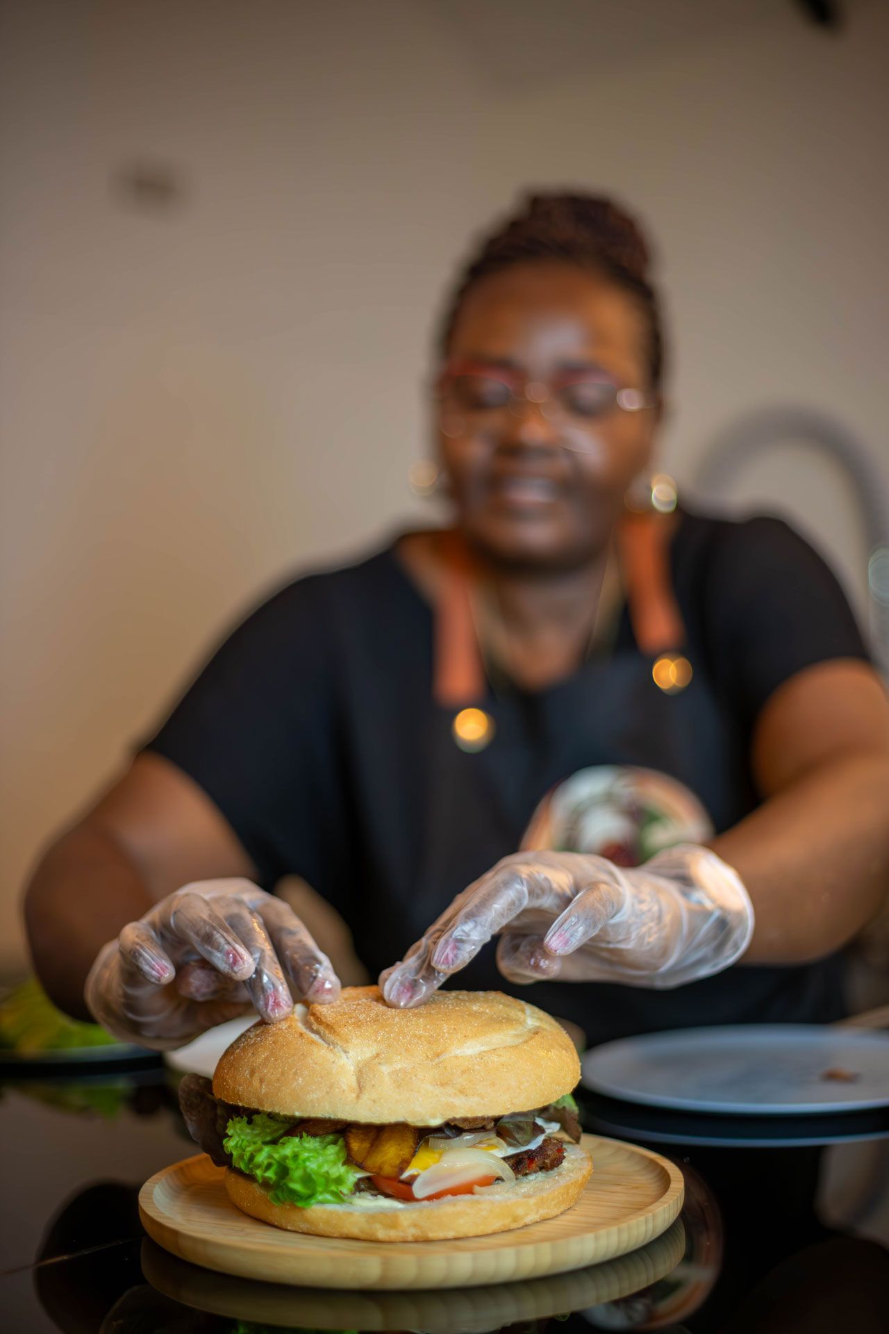 (Makemba burger : bananes plantains, double steak hachés, œuf, salade\poivrons, tomates, sauce maison) avec frites de patates douces